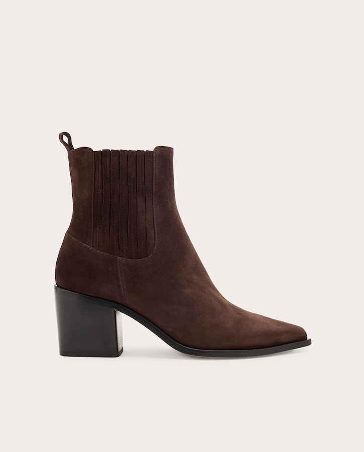 Botas Juliette em camurça com silhueta pontiaguda, painéis elásticos laterais e salto de 4,5 cm.