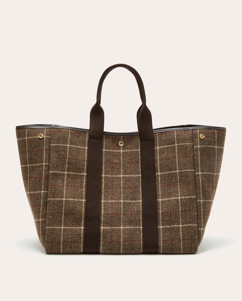 Mala shopper grande em lã estampada, com bolsos interiores, forro em lona, duas pegas e alça de ombro amovível.