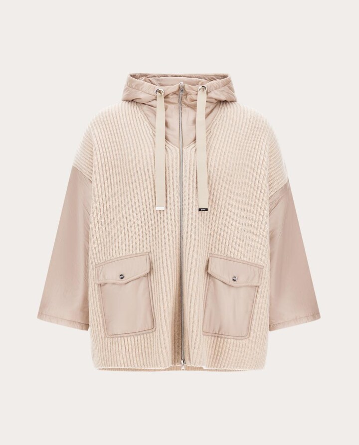 Casaco Resort feito de lã, com bolsos frontais, mangas compridas e capuz ajustável com cordões.