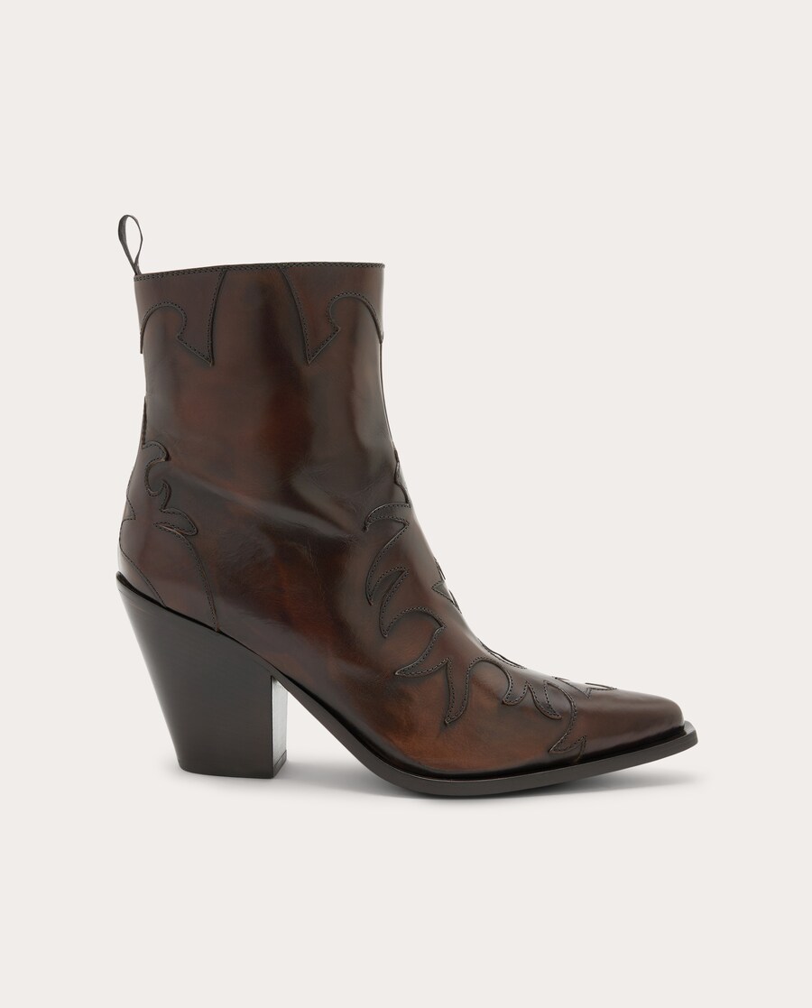 otas de couro com silhueta pontiaguda, detalhes recortados em forma de chamas, painéis elásticos laterais e salto de 8 cm.