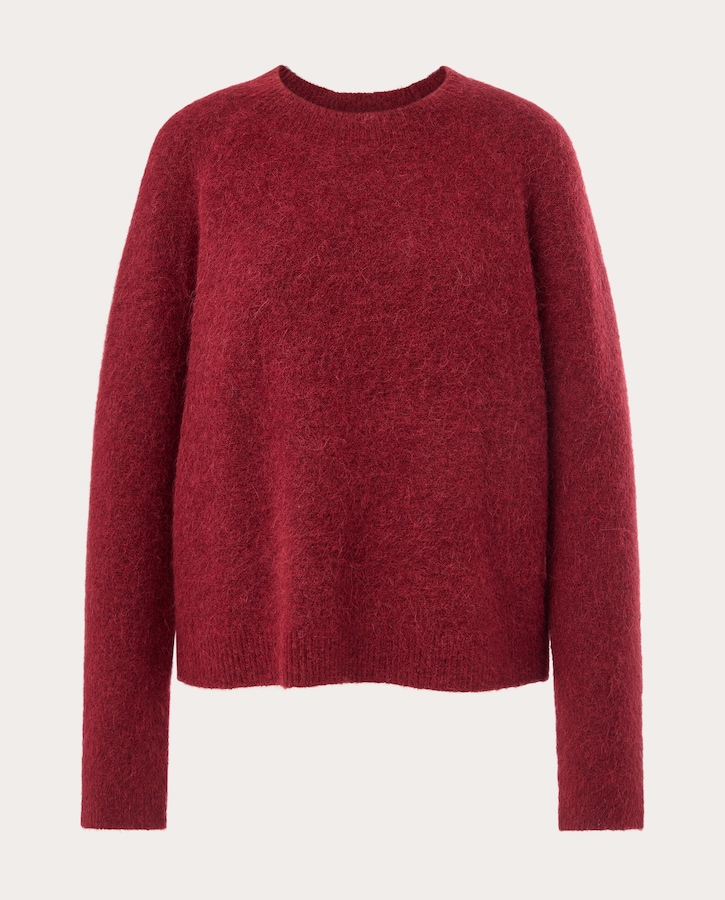 Camisola em lã de alpaca com efeito de pelo, gola redonda, manga comprida e acabamento canelado.