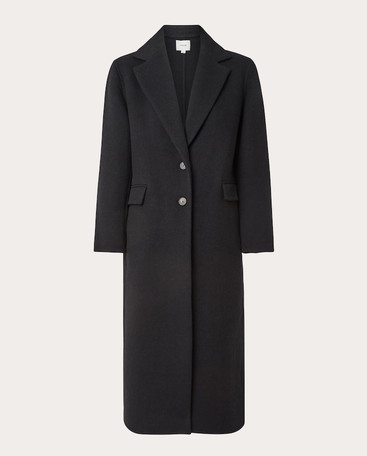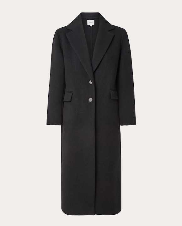 Casaco de lã com mistura de caxemira, gola com abas recortadas, bolsos laterais e fecho com botões.