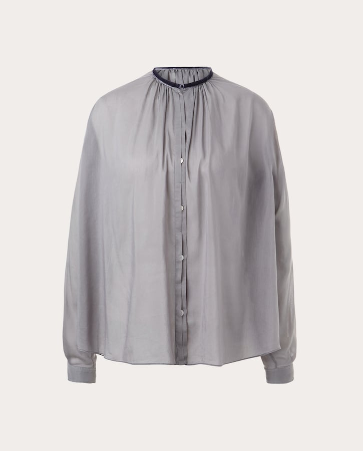 Camisa de algodão com mistura de seda, detalhes franzidos, gola mao, mangas bufantes e fecho com botões.