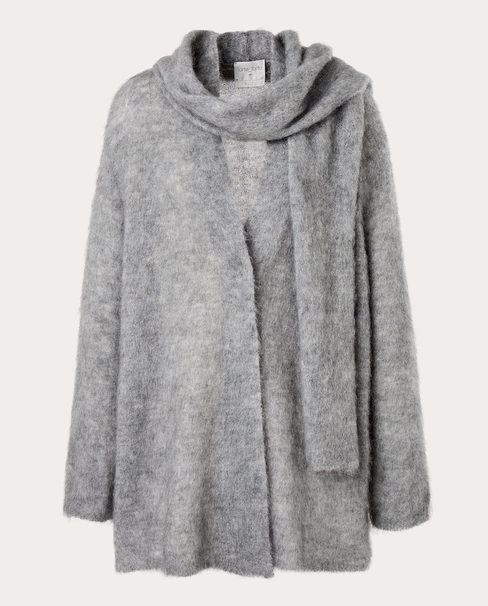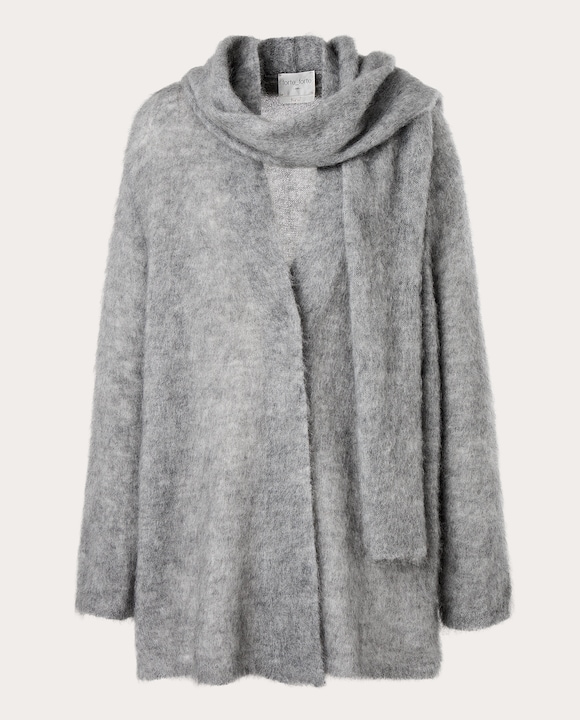 Camisola comprida de lã, com detalhe de laço no pescoço, manga comprida e bainhas caneladas.