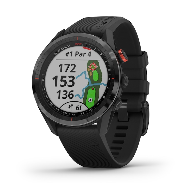 L'Approach S62 est une montre GPS de golf qui intègre les cartes et les informations essentielles dont vous avez besoin à votre poignet, le tout en couleur sur un écran tactile de 1,3 pouce. Améliorez votre score grâce à la nouvelle fonction caddie virtuel qui utilise les données de coups de vos précédentes parties, ainsi que les conditions de vent, pour déterminer le club que vous devez utiliser et où vous devez viser pour votre prochain coup. La fonction Playslike distance règle la distance en tenant compte de la vitesse, de la direction du vent, des obstacles et du dénivelé qui vous sépare de votre cible Effectuez un suivi de partie grâce à la fonction qui enregistre automatiquement la position et la distance de chaque coup détecté par la montre. Vous pouvez ensuite coupler ces données aux capteurs Approach CT10 pour un suivi plus précis de vos coups avec chaque club. Utilisez l'application Garmin golf (TM) pour analyser vos coups, participer à des tournois, des classements et disposer d'informations sur chaque terrain. Profitez pleinement de vos parties de golf avec une montre parfaite pour chaque occasion et tirez parti de ses fonctionnalités au quotidien, telles que le suivi de la fréquence cardiaque au poignet, le niveau de saturation d'oxygène dans le sang grâce au capteur Pulse Ox3, les notifications intelligentes, les fonctions de suivi d'activité et y compris Garmin Pay