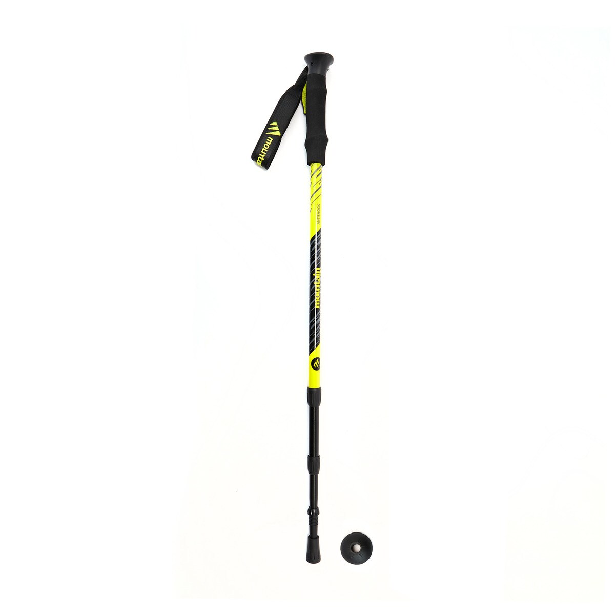 Bastão de caminhada com 3 secções de alumínio, cabo em EVA, correia almofadada ajustável, sistema de fecho convencional e ponta de carbono.