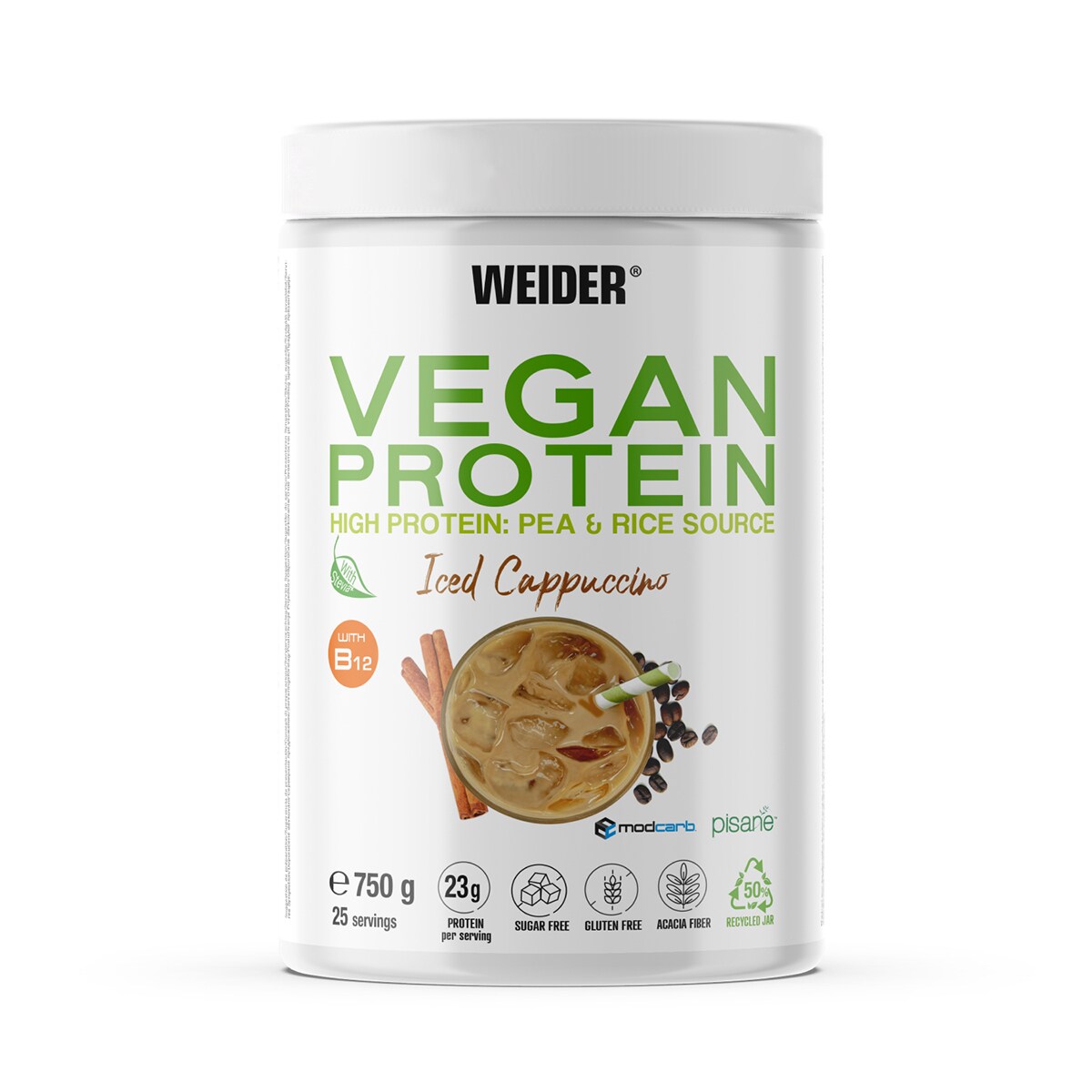 Mistura de proteínas vegetais em pó para preparar uma bebida. Com edulcorante. Sabor a cappuccino gelado.