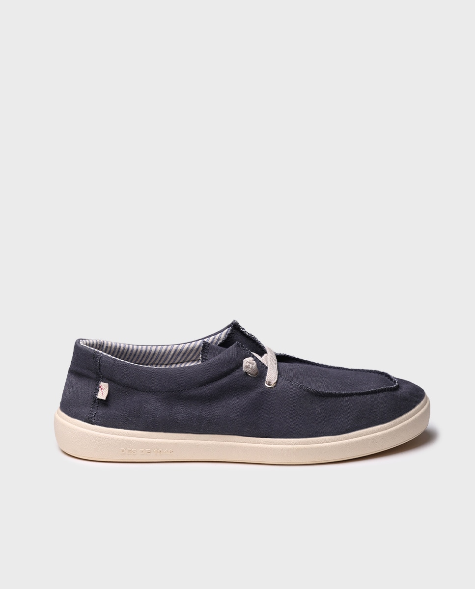 IAN. Este sapato de homem com sola de borracha e atacadores está elaborado em tecido de algodão. Conta com uma palmilha acolchoada de algodão que lhe aporta uma grande comodidade. Tem uma altura total de 3 cm e a base da sola é de borracha antiderrapante. Trata-se de um design 100% vegano.Estas alpercatas estão tingidas com um sistema de lavagem exclusivo para lograr um aspeto desgastado. As variações de cor são intencionais.Este modelo calça o tamanho habitual, se estás entre dois tamanhos recomendamos escolher o mais pequeno.