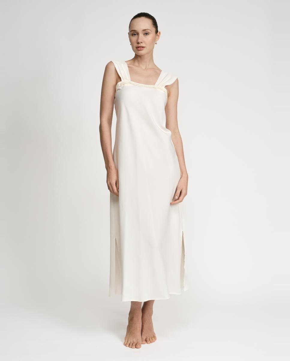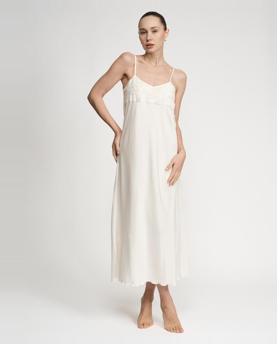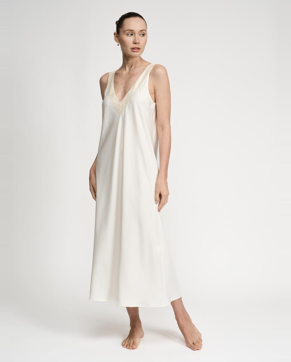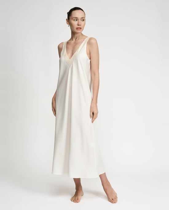 Camisa de Dormir Comprida de Cetim Mate com Rendas