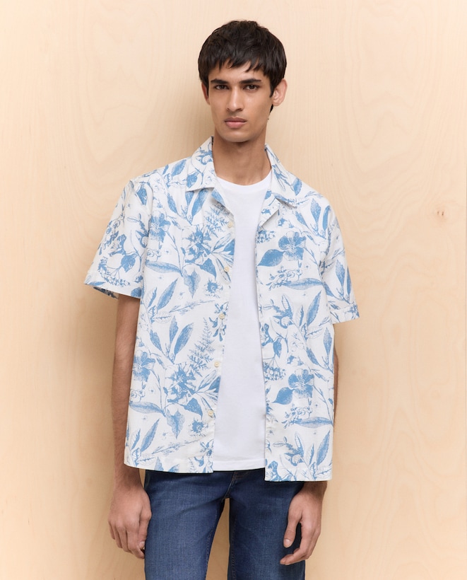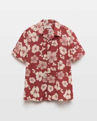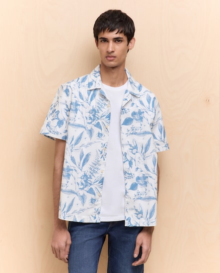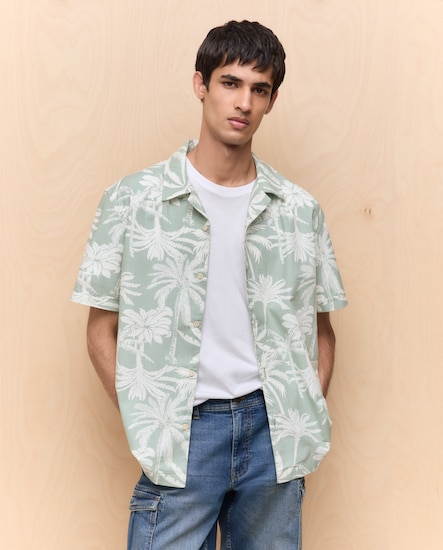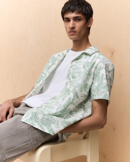 Camisa Bowling com Manga Curta e Estampado de Folhas