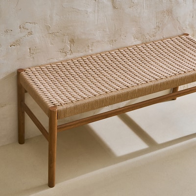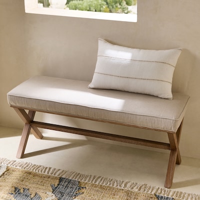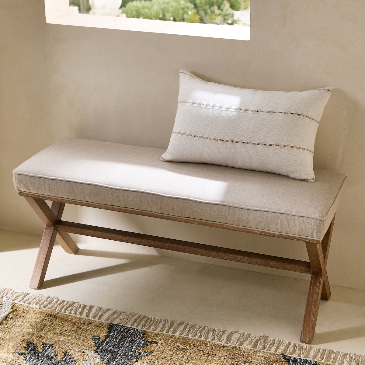 Banco Quadrado de Carvalho e Estofado em Linho Vintage