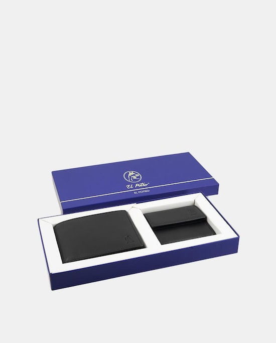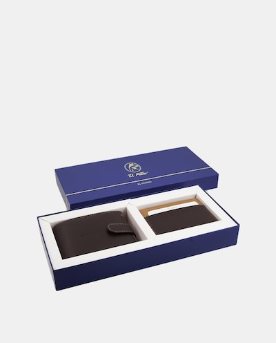 Carteira de pele castanha com porta-moedas e alfinete de homem