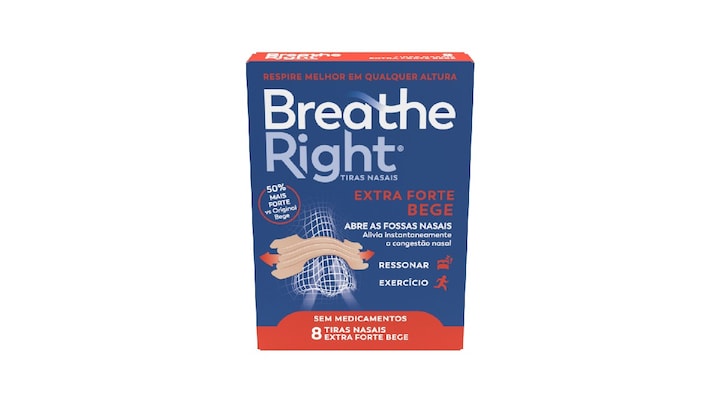 Breathe Right Extra Forte são tiras nasais, 50% mais fortes que as Originais que permitem elevar e abrir suavemente as fossas nasais, melhorando a capacidade respiratória e aumentando até 31% o fluxo de ar, sem recurso a medicamentos. Indicadas para: – Reduzir, podendo até eliminar, o ressonar, contribuindo para uma melhoria da qualidade sono; – Aliviar, de forma instantânea, a congestão nasal, causada por patologias respiratórias como alergias ou constipações; – Aliviar a dificuldade respiratória em casos de desvio do septo nasal; – Melhorar a respiração durante o exercício físico ou outras atividades aeróbicas. Alívio imediato e prolongado até 12h. Tamanho pequeno/médio – indicado para 75% dos narizes e para crianças maiores de 5 anos. Disponível também em tamanho grande. Cada embalagem contém 10un. Disponível também em embalagens de 30un.