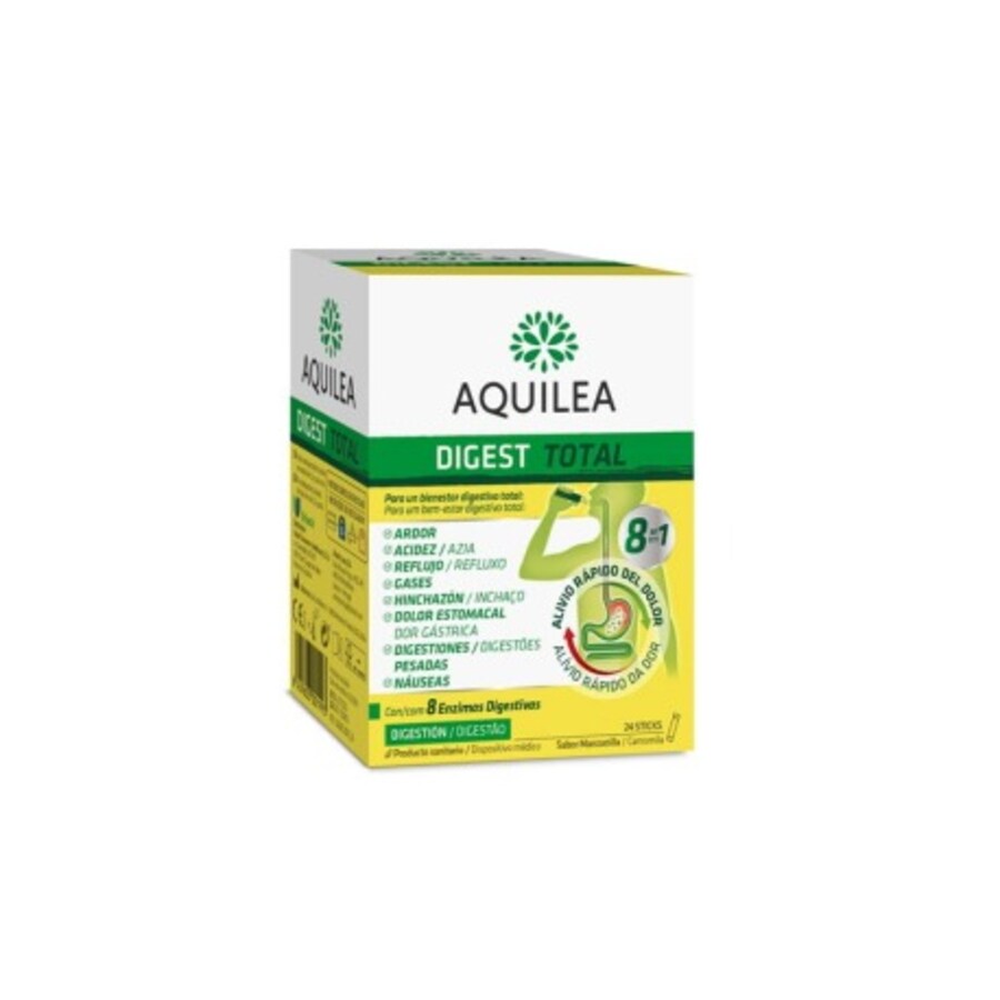 O Aquilea Digest Total Camomila é um suplemento alimentar em formato de sticks orodispersíveis, formulado para proporcionar alívio rápido e eficaz dos principais sintomas digestivos, como azia, refluxo, gases, inchaço abdominal, digestões pesadas e náuseas. Cada stick contém uma combinação de 8 enzimas digestivas e minerais essenciais, incluindo simeticona, que ajudam a melhorar a digestão e o bem-estar gastrointestinal