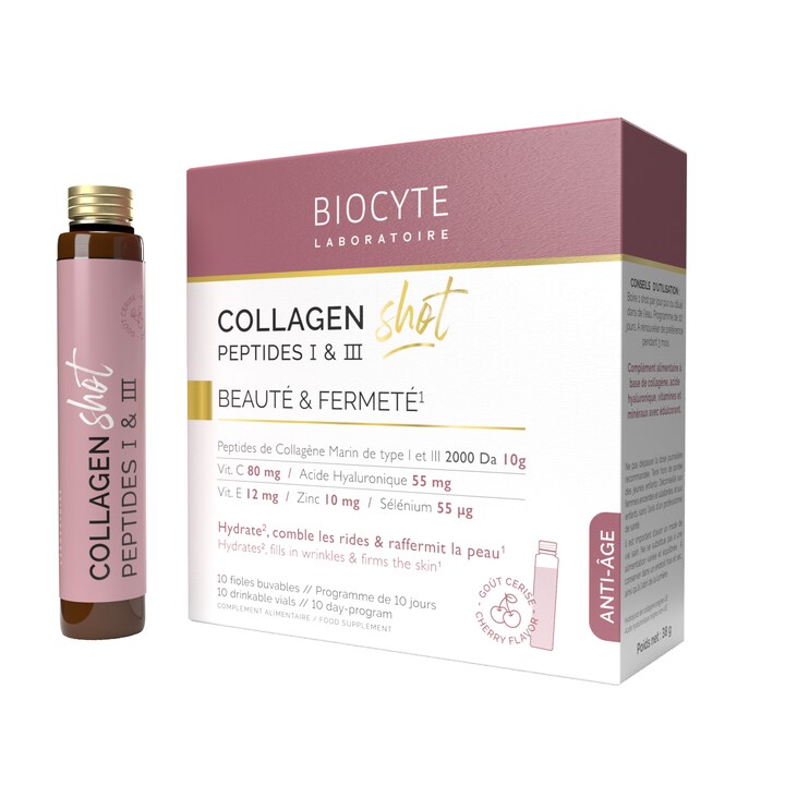 BIOCYTE COLLAGEN SHOT é um suplemento em formato de shot que hidrata, preenche as rugas e reafirma a pele, graças ao colagénio marinho e ao ácido hialurónico. Uma fórmula completa com 10 g de colagénio marinho tipo I e III, patenteado pela Naticol, cuja eficácia foi comprovada com +22,8% de hidratação, +23,7% de elasticidade e -9,4% de rugas.