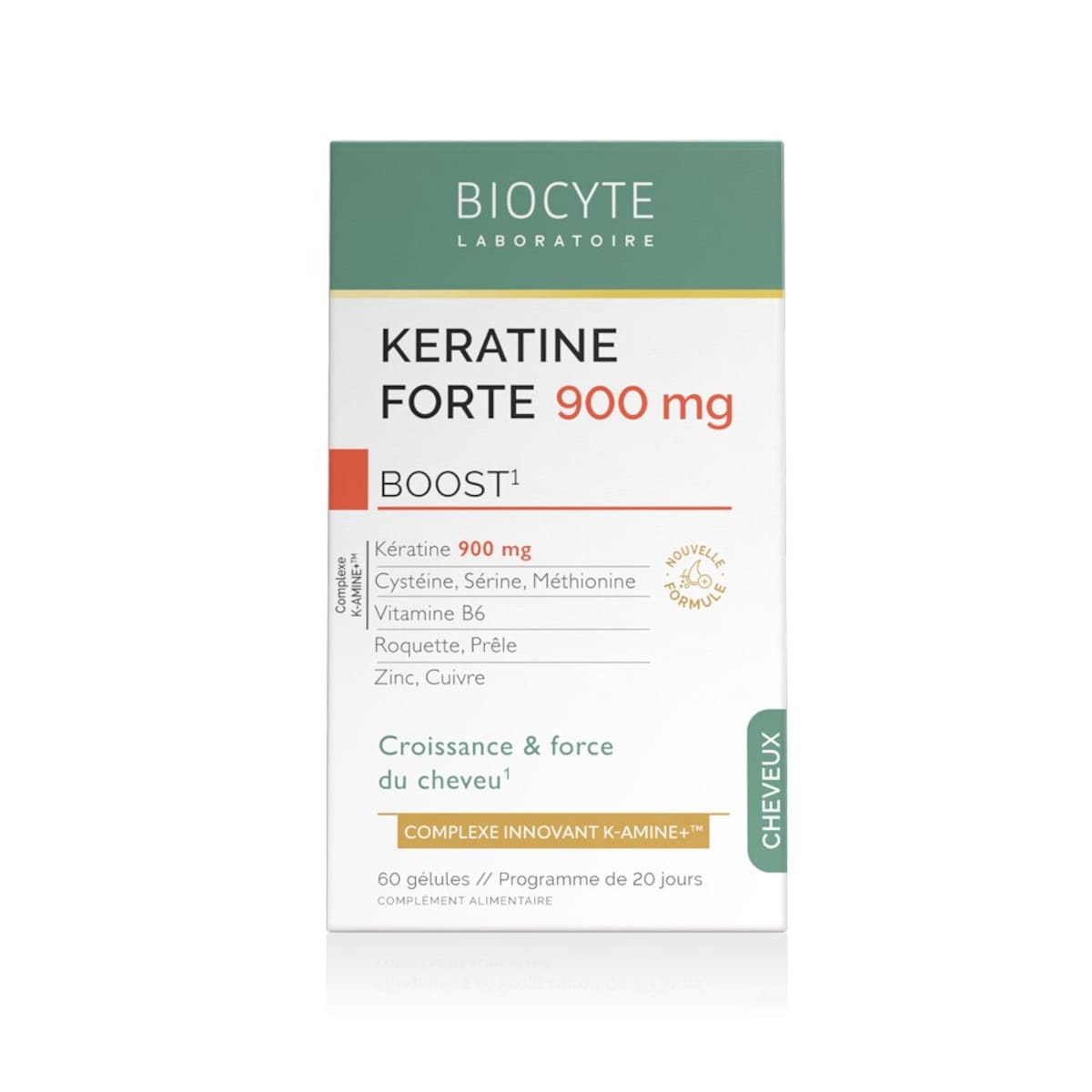 O Keratine Forte 900mg é um suplemento alimentar desenvolvido para estimular o crescimento capilar e fortalecer a estrutura do cabelo. Formulado com o inovador complexo K-AMINE+®, que combina queratina hidrolisada de elevada absorção e aminoácidos essenciais como a cisteína, serina e metionina, essenciais para o fortalecimento capilar. Enriquecido com extratos de Cavalinha e Rúcula, que promovem o crescimento capilar, estimulam o foliculo capilar e fortalecem a fibra capilar. As vitaminas B6, B8, B3 e B5, juntamente com os minerais zinco e cobre, completam esta fórmula para auxiliar a síntese normal de queratina e melhorar a saúde geral do cabelo. A eficácia de KERATINE FORTE 900mg foi comprovada através de um estudo de satisfação, no qual 94% das mulheres relataram cabelos mais fortes e 92% relataram cabelos mais resistentes após dois meses de utilização.