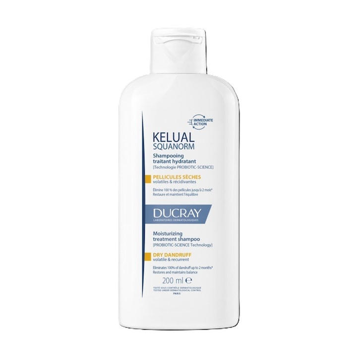 O champô hidratante KELUAL SQUANORM, especificamente adaptado para a caspa seca, representa a primeira geração de champôs anticaspa de alto desempenho inspirados nos efeitos benéficos e prolongados dos probióticos. Graças à sua tecnologia PROBIOTIC-SCIENCE, elimina suavemente 100% da caspa visível desde a 1.ª aplicação* e previne o reaparecimento da caspa durante 2 meses**. Recupera um couro cabeludo saudável, hidratado e confortável em apenas 1 lavagem com champô*. Além da sua ação anticaspa, este champô de tratamento deixa imediatamente o cabelo flexível, brilhante e suave.
