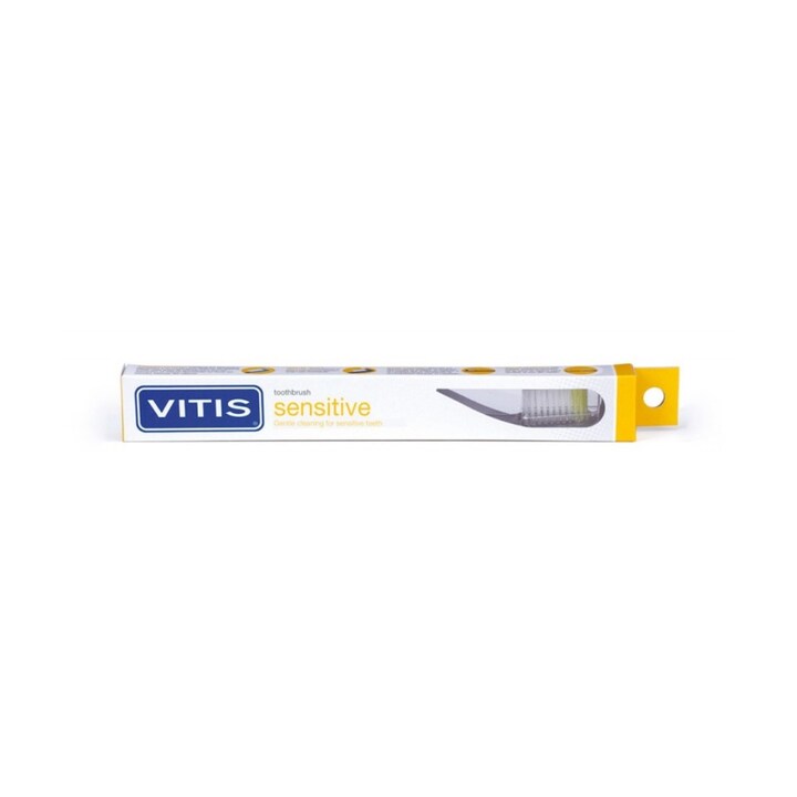 Vitis Escova de Dentes Sensitive apresenta filamentos muito macios e de perfil reto, que permitem uma escovagem delicada sem provocar dor em pacientes com problemas de sensibilidade dentária ou gengivite (doença das gengivas).