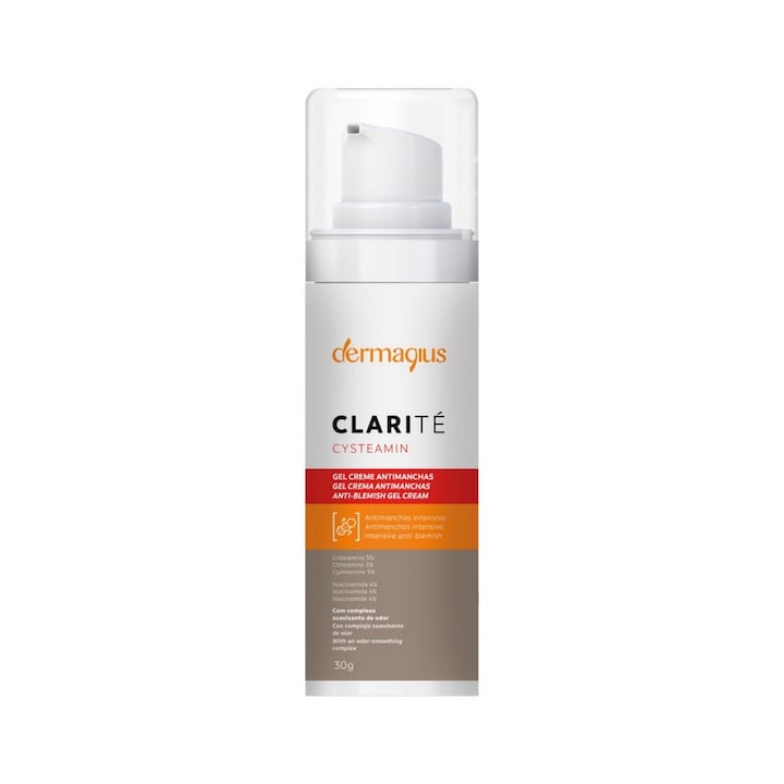 Cisteamina a 5%: produzida naturalmente nas células humanas, é um ativo biológico que controla a produção de melanina na pele com a mesma eficácia que a hidroquinona, mas sem seus fortes efeitos adversos.