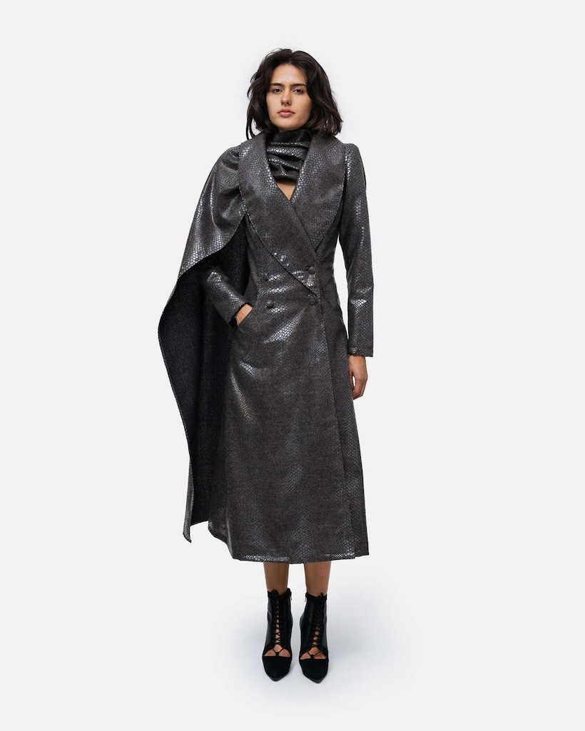 Vestido tipo Robemanteau gola drapeada formato capa nas costas