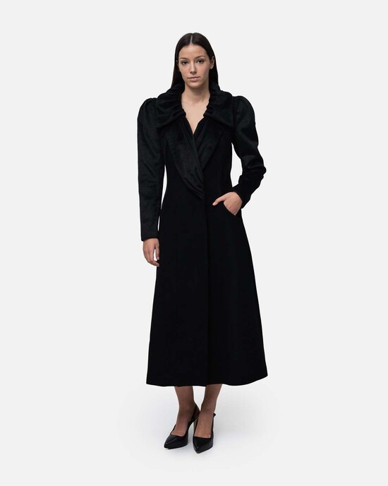 Sobretudo mix materiais lã e alpaca gola dupla e mangas drapeadas nos ombros