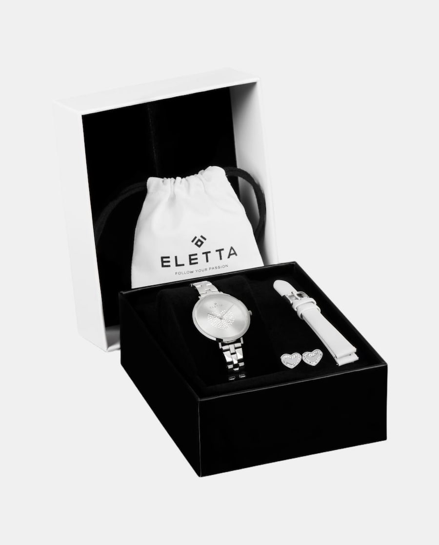 Para completar a experiência, este conjunto inclui uma bracelete extra de 12mm em pele branca, com fivela em aço prateado, e um par de brincos Hearts também em aço prateado, em forma de coração e rodeados de cristais.