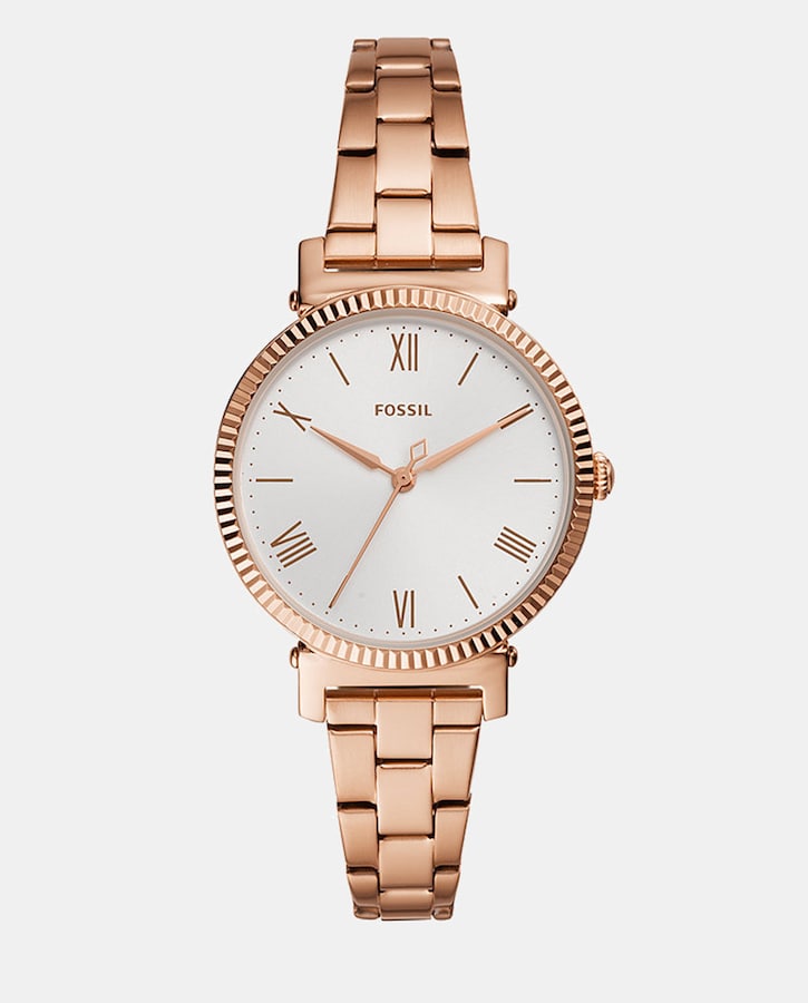 Relógio com caixa em aço inoxidável PVD rosa dourado com mostrador prateado efeito raios de sol e bisel estriado. Pulseira em aço inoxidável PVD rosa dourado de 14 mm.