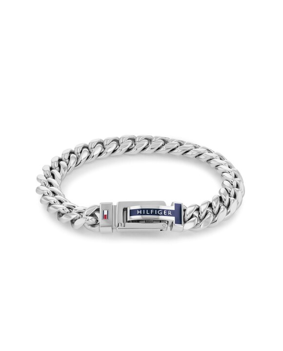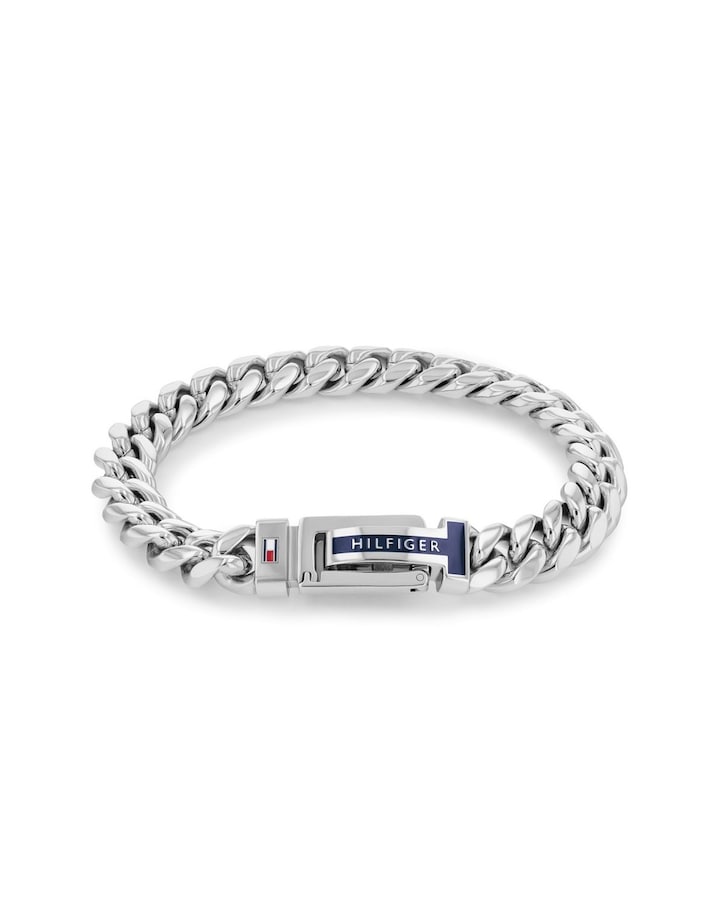 Pulseira de aço inoxidável com fecho de encaixe com logo gravado.