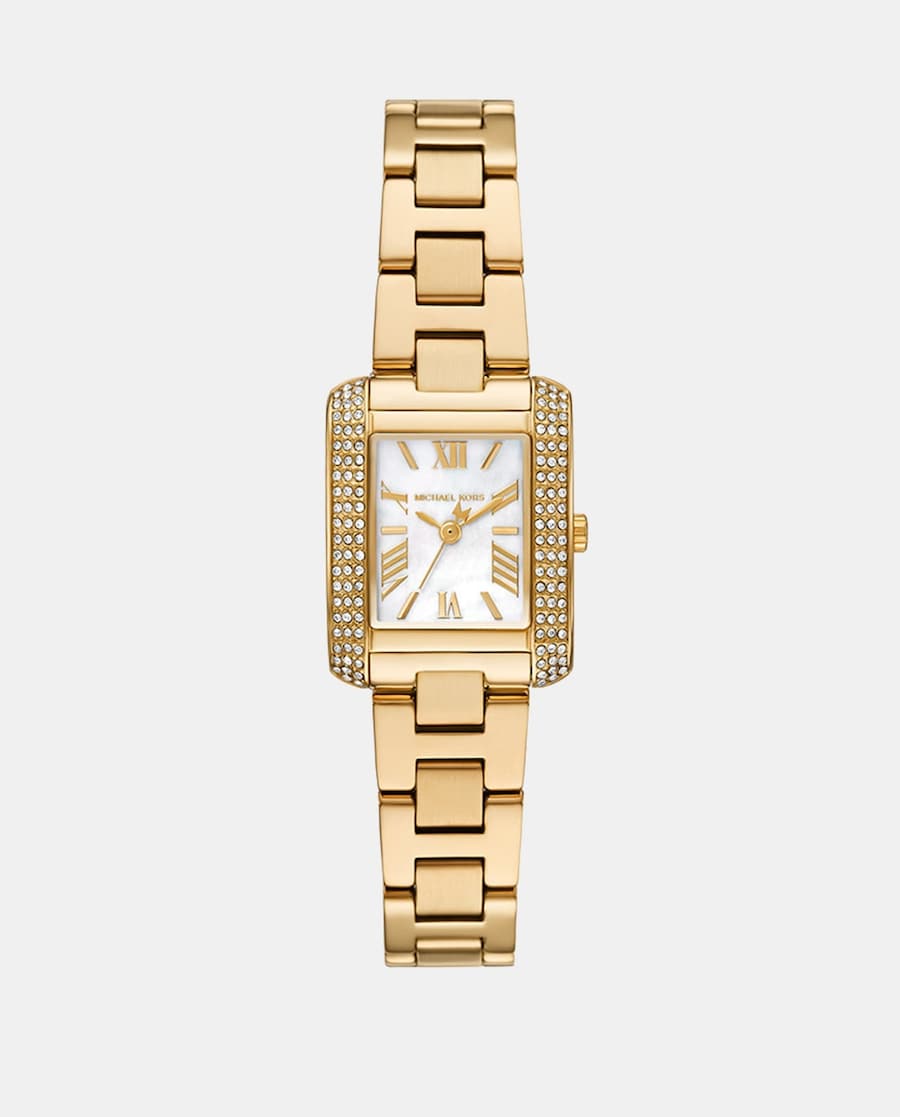 Este relógio Emery da Michael Kors, com 22 mm, tem um mostrador brilhante em madrepérola branca, movimento de três ponteiros e bracelete em aço inoxidável dourado.
