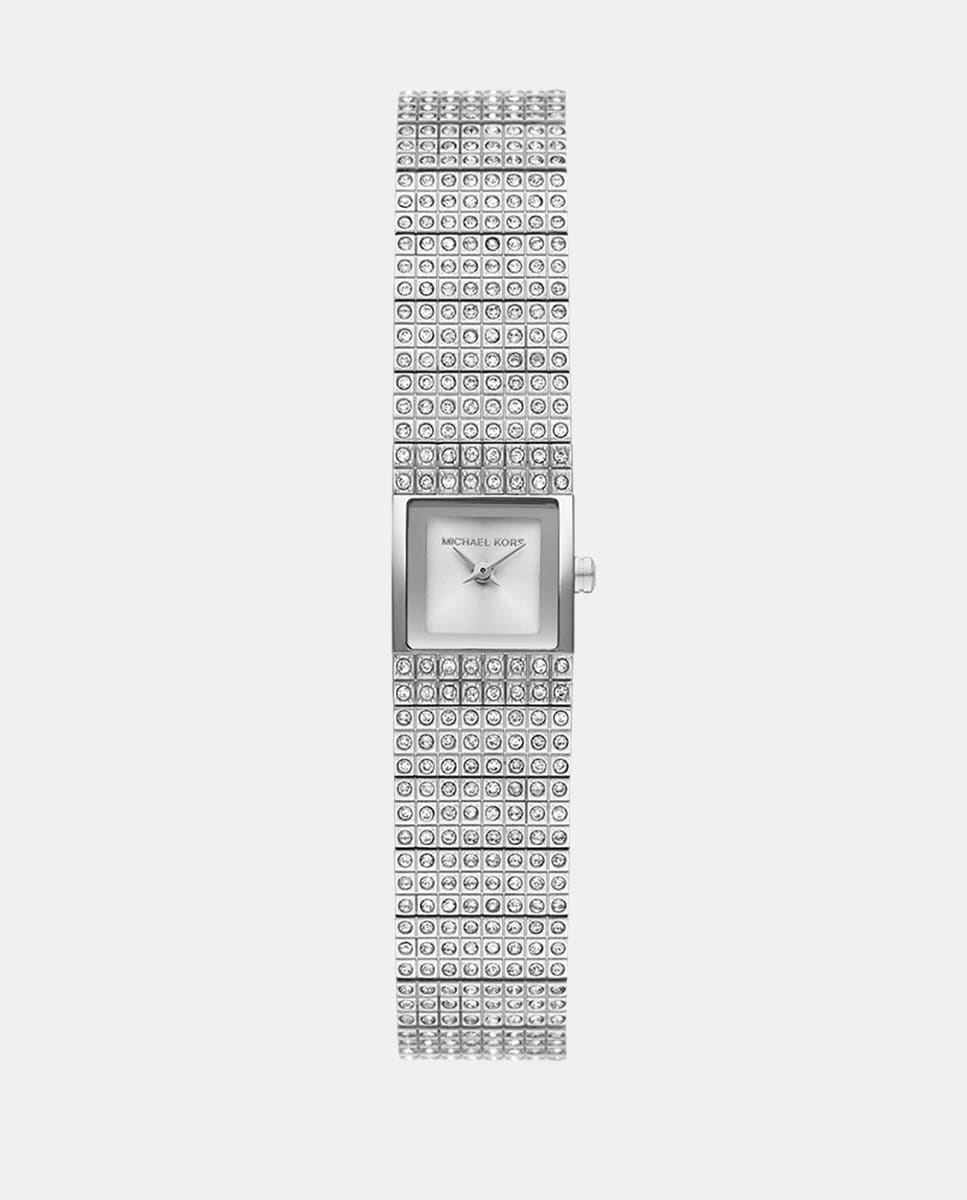 Darrington é uma coleção moderna com linhas simples e detalhes inspirados em jóias. A caixa em tom prateado e a bracelete de cristais acrescentam um elemento de brilho, dando um toque elegante e sofisticado a este design de micro-mini quadrado.