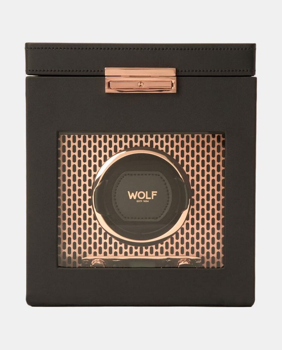 A caixa AXIS apresenta um visual moderno e arrojado para guardar os seus relógios. A nossa tecnologia patenteada de contagem das rotações do eixo do seu relógio garante rotações precisas por dia. Luxo arrojado, design impecável, experimente o AXIS. Possui tampa de vidro com fecho, ecrã LCD retroiluminado, ferragens com acabamento em cobre e um único módulo de corda com armazenamento.