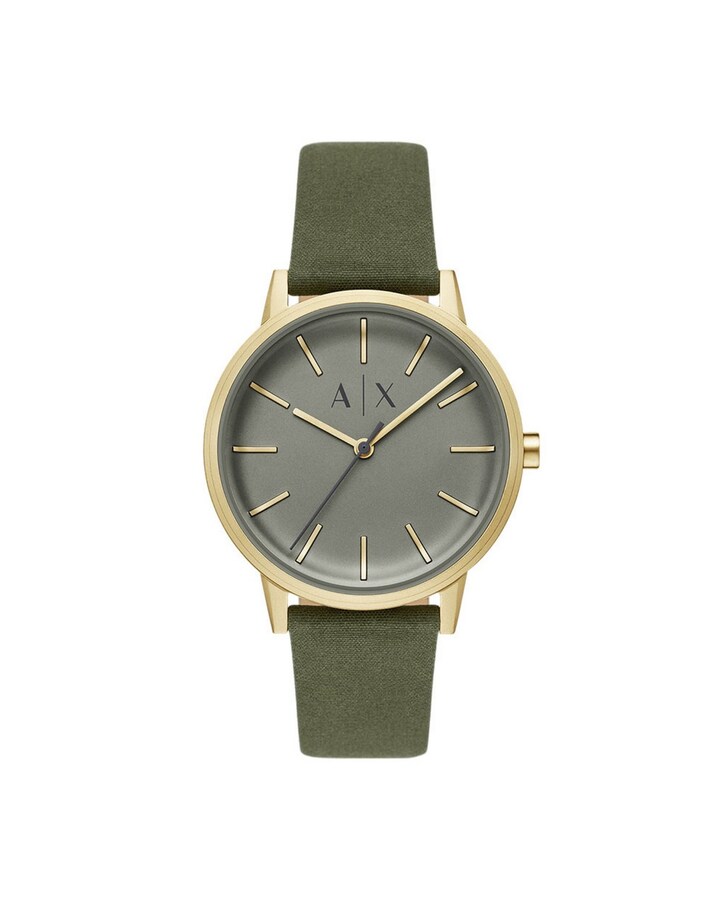 O relógio Armani Exchange de 42 mm com caixa em aço inoxidável dourado combina com um mostrador verde mate para criar um look monocromático refinado. A bracelete em tecido verde texturado acrescenta profundidade e contraste, fixada com um fecho de fivela simples. As linhas simples e a funcionalidade minimalista dos três ponteiros completam o design, que combina a simplicidade moderna com uma cor marcante.
