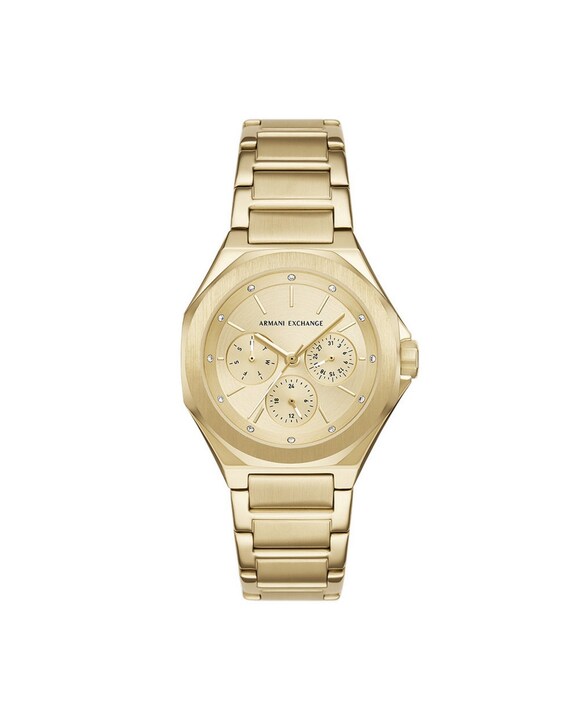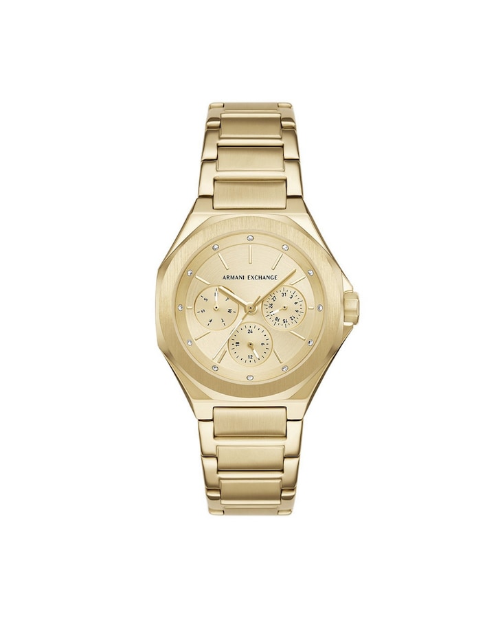 O relógio Armani Exchange de 36 mm com mostrador escovado em tom dourado combina na perfeição com a bracelete a condizer, criando um design monocromático moderno e coeso. A caixa octogonal acrescenta um toque geométrico, enquanto os submostradores multifuncionais proporcionam uma utilidade adicional. Com um fecho dobrável de dois botões, a bracelete em aço inoxidável é uma verdadeira declaração de sofisticação simples.