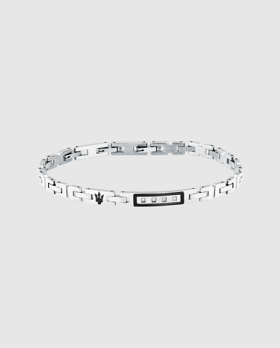 Pulseira de homem Maserati de aço. "Pulseira para homem Maserati, coleção DIAMONDS em aço, com logo do Tridente, detalhes com diamantes, comprimento 18 + 3,5 cm. A joia se caracteriza por um prático fecho de joalharia. A joia é apresentada na sua embalagem original, um cartão identificativo da coleção e com uma garantia de 2 anos. Joalharia Maserati: linhas inovadoras e geometrias refinadas desenham pulseiras com perfis elegantes, fabricadas em aço e cerâmica. Estas pulseiras são complementadas com outras propostas em couro entrelaçado e detalhes em aço.