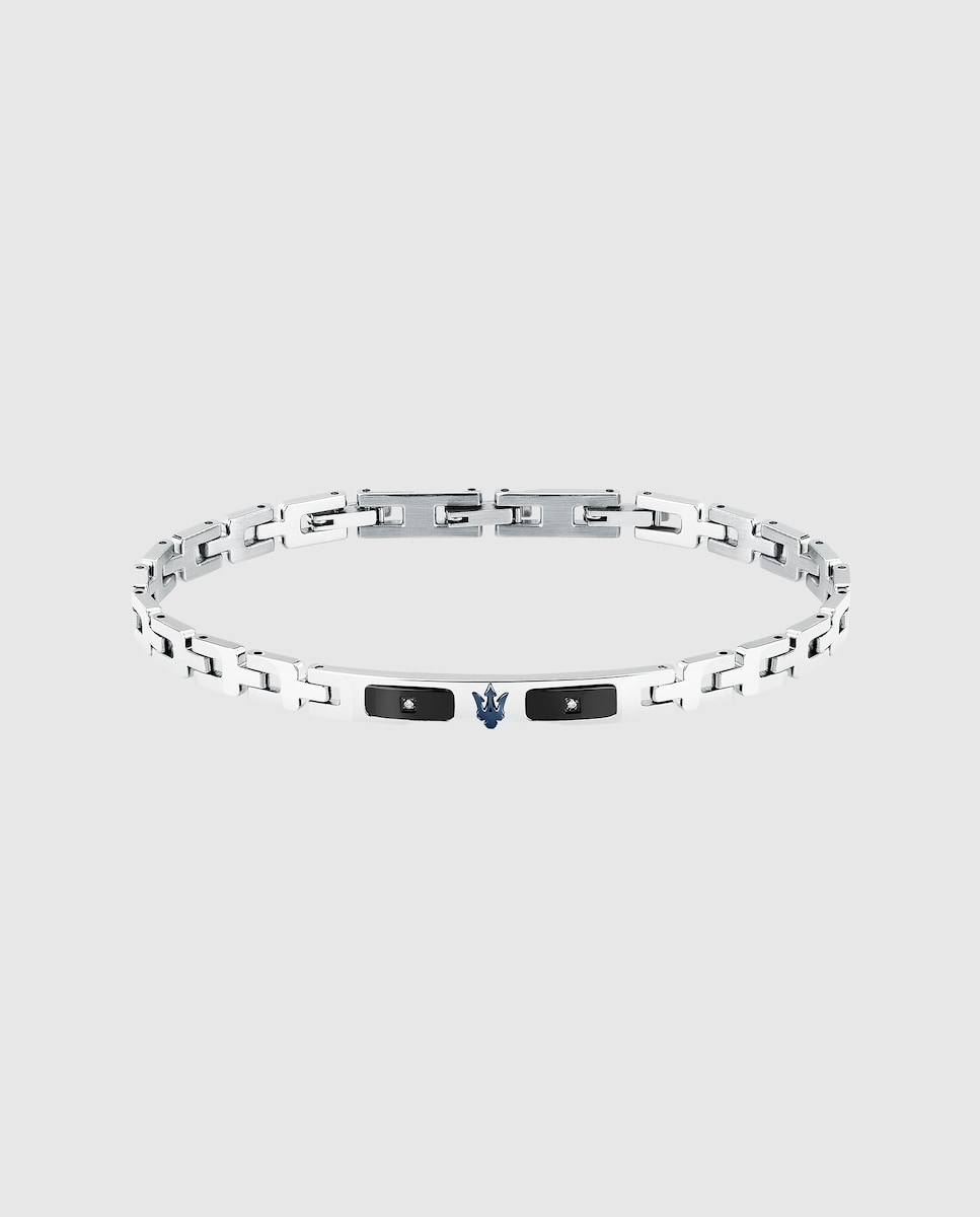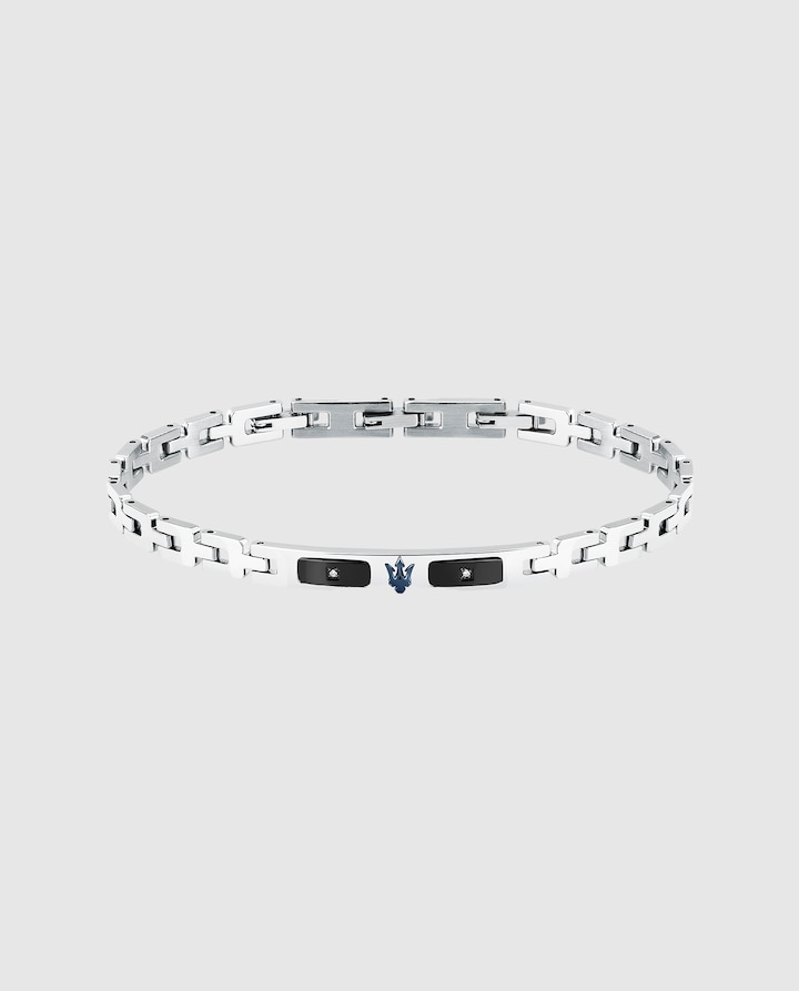 Pulseira de homem Maserati de aço. "Pulseira para homem Maserati, coleção DIAMONDS em aço, com logo do Tridente, detalhes com diamantes, comprimento 18 + 3,5 cm. A joia se caracteriza por um prático fecho de joalharia. A joia é apresentada na sua embalagem original, um cartão identificativo da coleção e com uma garantia de 2 anos. Joalharia Maserati: linhas inovadoras e geometrias refinadas desenham pulseiras com perfis elegantes, fabricadas em aço e cerâmica. Estas pulseiras são complementadas com outras propostas em couro entrelaçado e detalhes em aço.