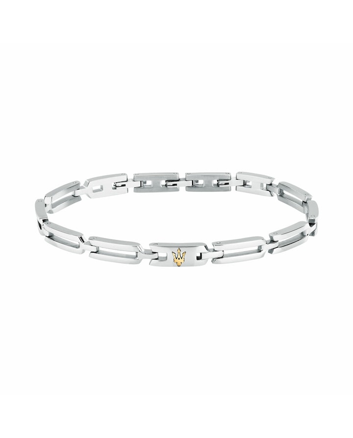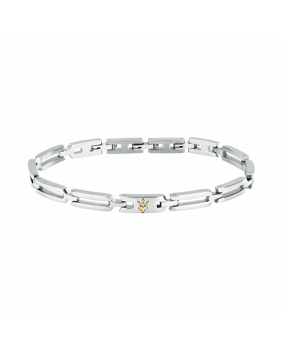 Pulseira de homem Maserati de aço. "Pulseira para homem Maserati, coleção ICONIC em aço, comprimento 18 + 3.5 cm. A joia caracteriza-se por um prático fecho de joalharia. A joia é apresentada na sua embalagem original, com uma garantia de 2 anos. Joalharia Maserati: linhas inovadoras e geometrias refinadas desenham pulseiras com perfis elegantes e efeitos 3D, fabricadas em aço e cerâmica. Estas pulseiras são complementadas com outras propostas em couro entrelaçado e detalhes em aço.