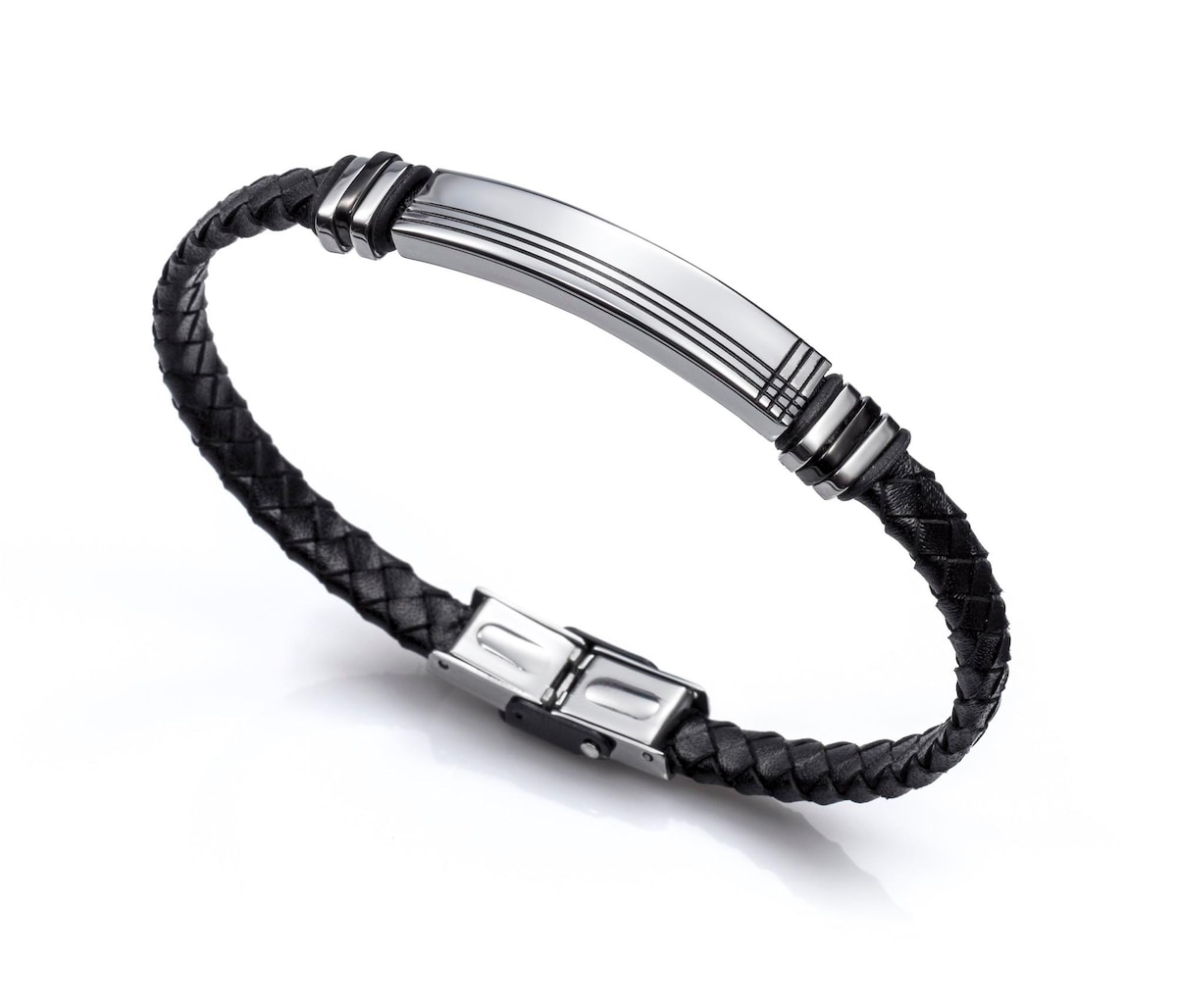 Pulseira de aço, com linhas cruzadas em preto e cordão trançado.