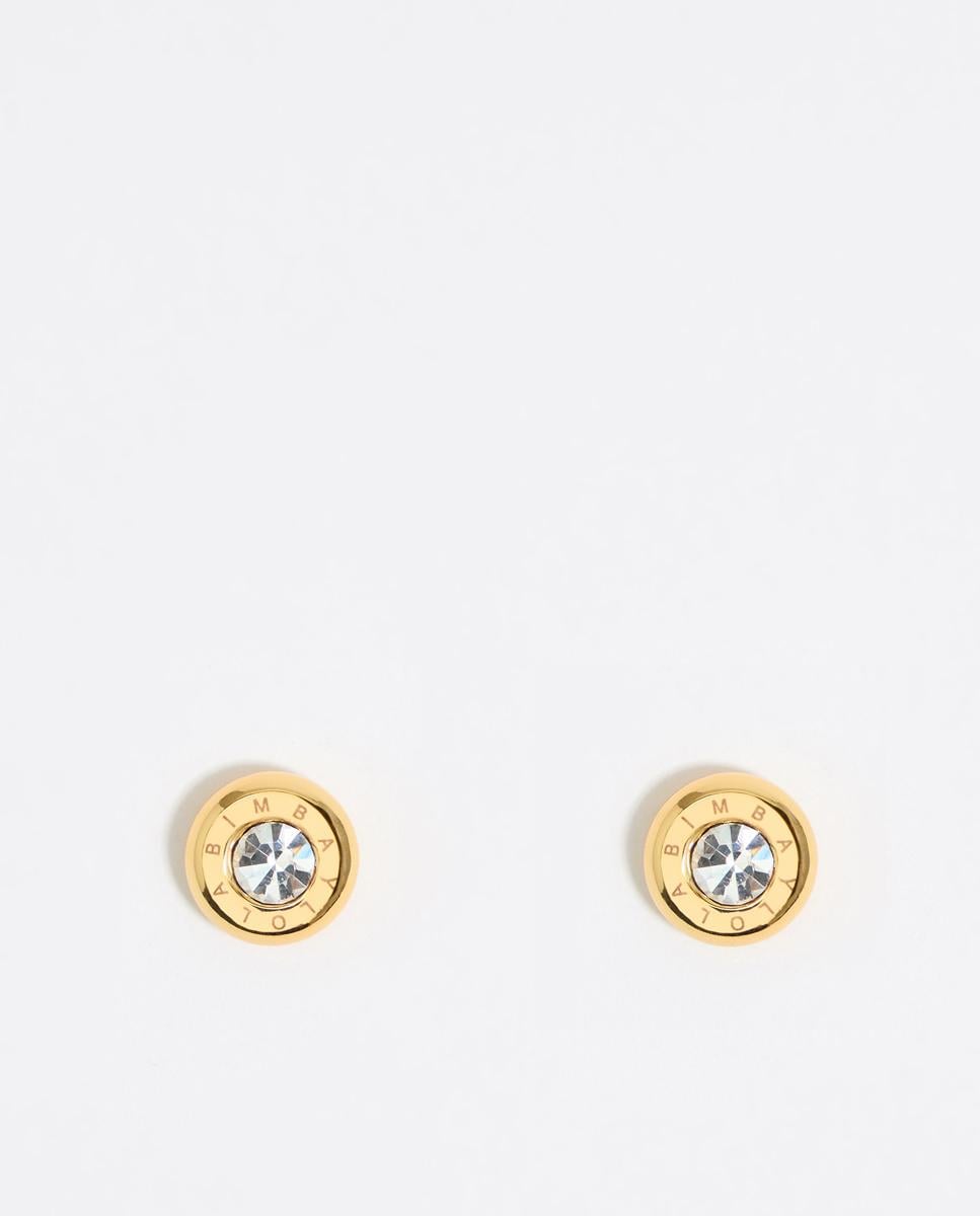 Brincos de metal dourado com logo e cristal. Modelo personalizado com logo gravado.