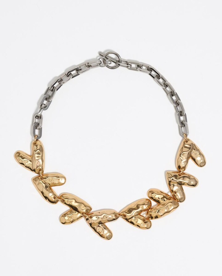 Colar de bijuteria para mulher da marca BIMBA Y LOLA, desenhado com uma série de corações com textura bicolor, combinando tonalidades de ouro e prata. Este acessório pertence à coleção Outono-Inverno 2025 e é ideal para complementar looks femininos com um toque elegante e contemporâneo. Destaca pelo seu acabamento metálico que aporta um brilho subtil, tornando-o numa peça versátil para diversas ocasiões.