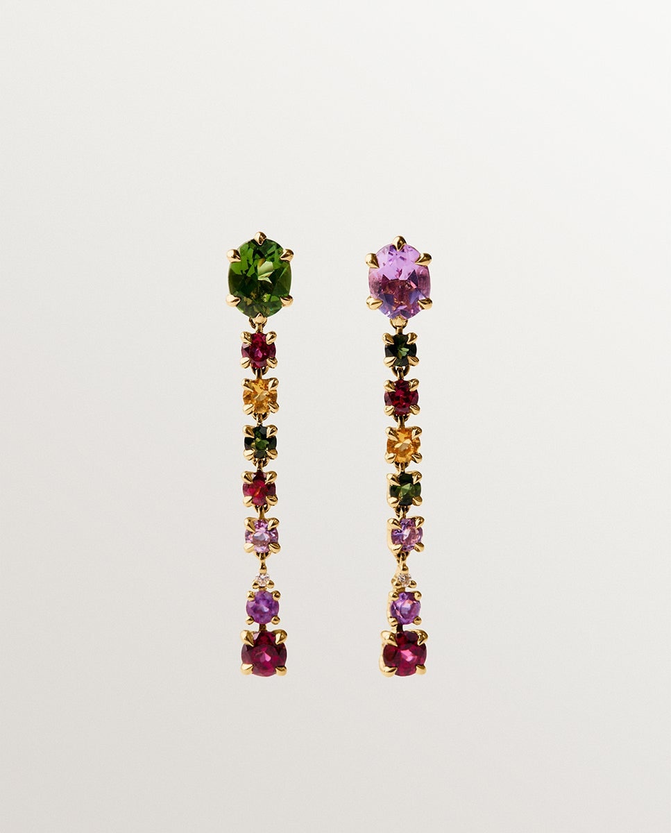 NovoAristocrazyBrincos Compridos de Ouro Amarelo de 18k com Ametistas Rosa e Pretas, Turmalinas Verdes, Rodolitos e DiamantesAdicionar