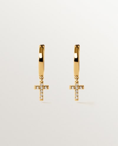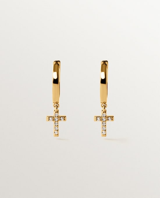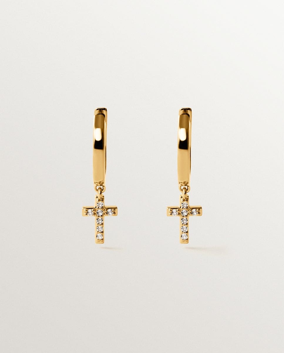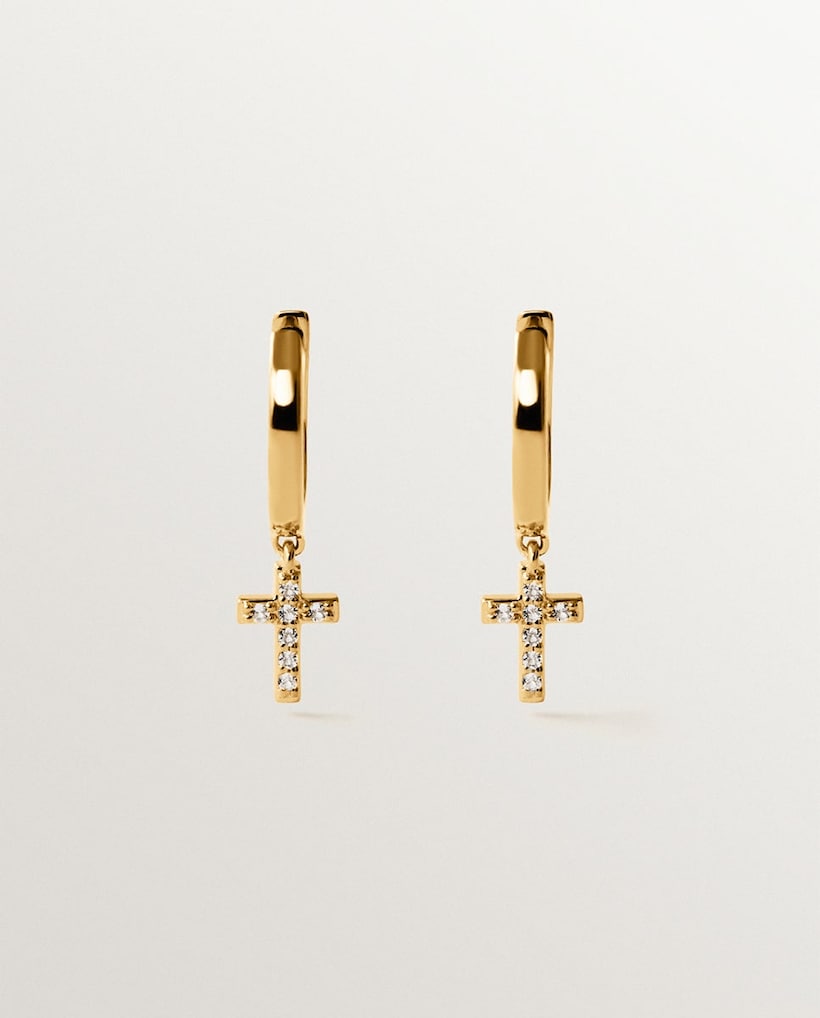 NovoAristocrazyBrincos de Argola de Prata 925 Banhada em Ouro Amarelo de 18k com Topázios Brancos e Forma de CruzAdicionar