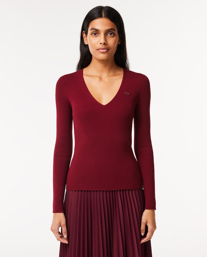 Camisola de Malha Canelada sem Costuras e com Decote em Bico