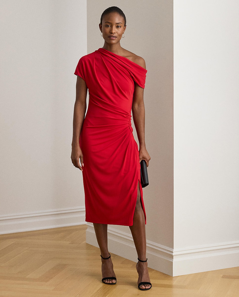 Vestido Midi de Veludo com Gola Assimétrica