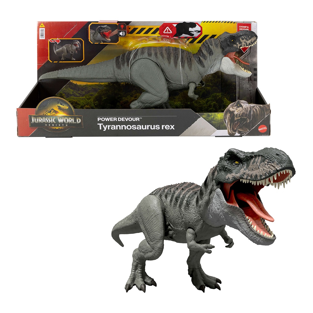 MATTELDinossáuro Jurassic World Rebirth Figura de Tiranossauro Rex Power Devour com Luzes, Sons e Mordidas ContínuasAdicionar
