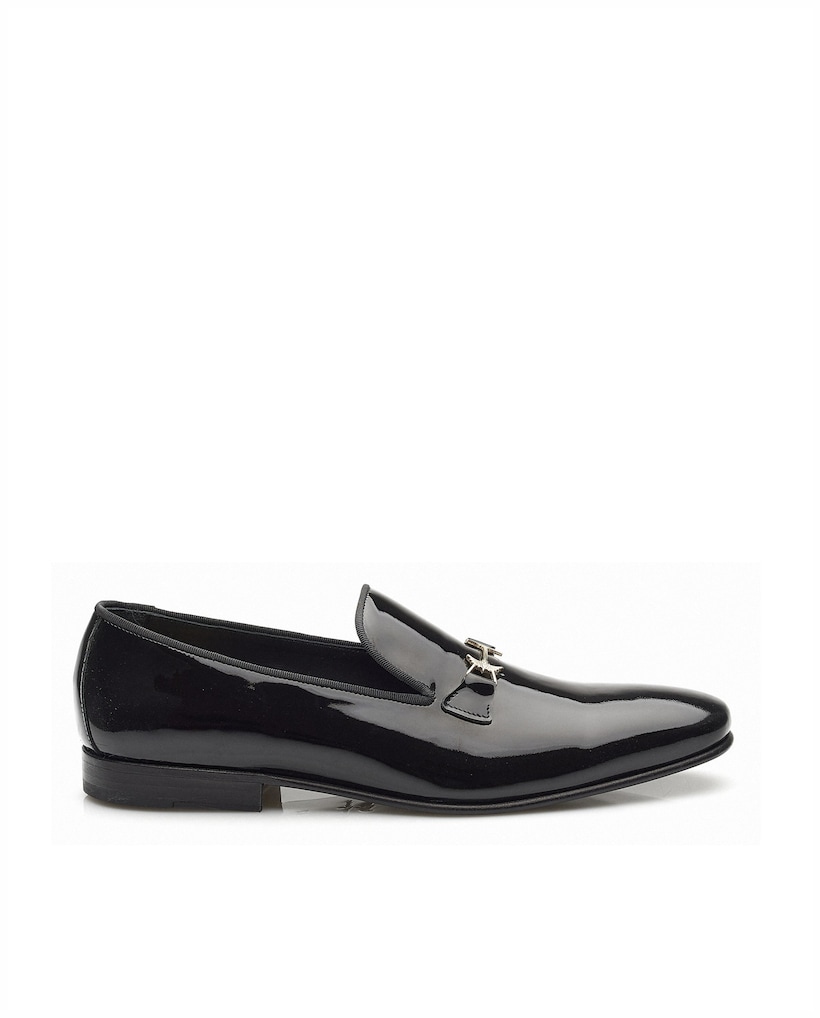 Miguel VieiraMocassin em verniz, forro em pele, com travessão e aplicação metálica Miguel VieiraAdicionar
