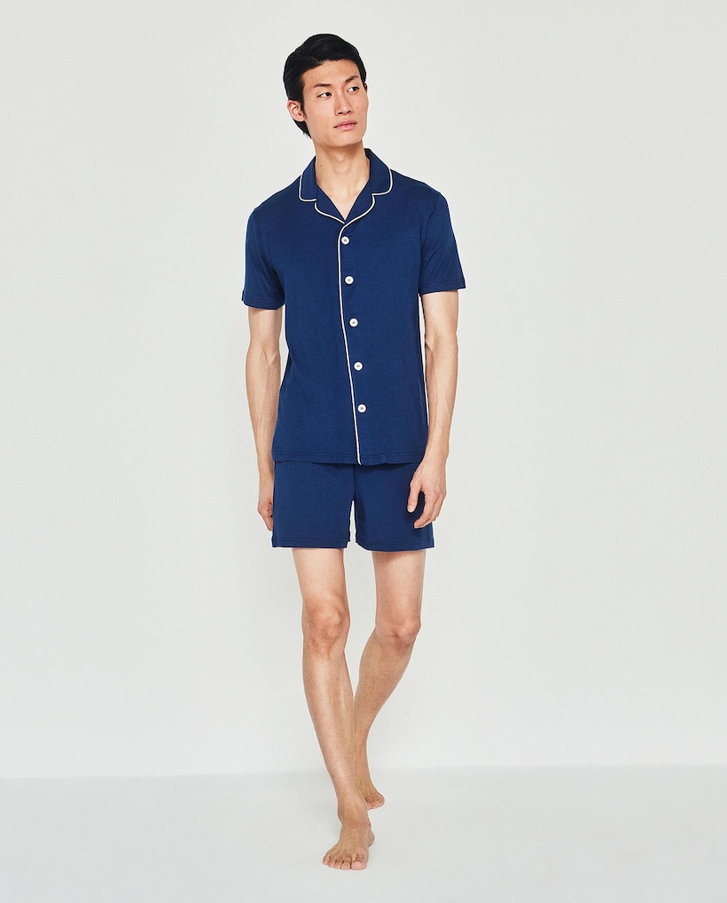 Pijama Curto Liso em Algodão Acetinado Azul-marinho