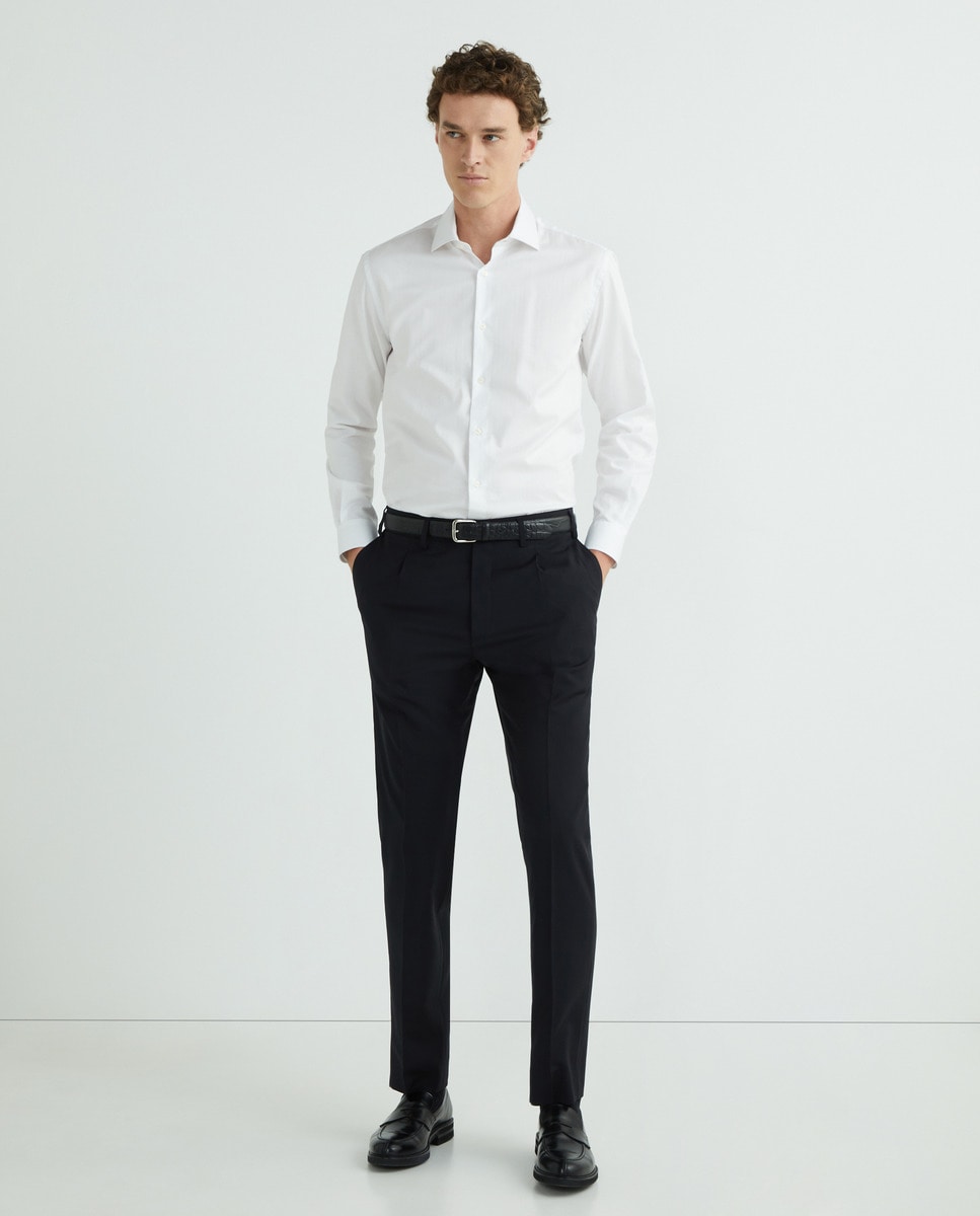 Tradicionais, soltos e elegantes. Cintura alta, perna ampla e corte recto até ao tornozelo.