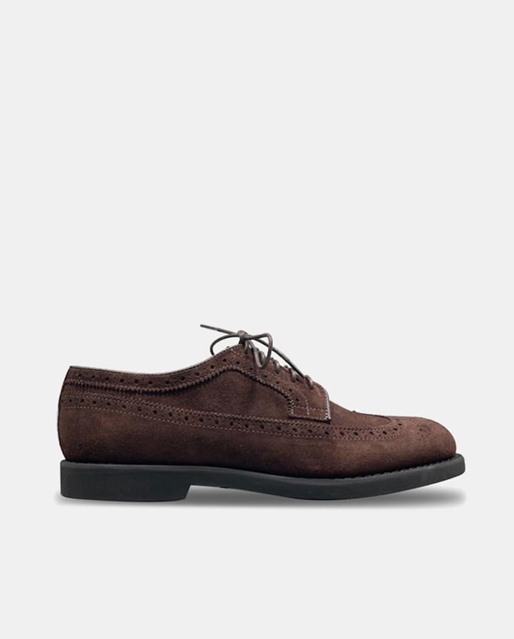 Sapatos de Atacadores Wingtip com Detalhe de Perfurações, Sola de Borracha e em Camurça - Castanho-Escuro
