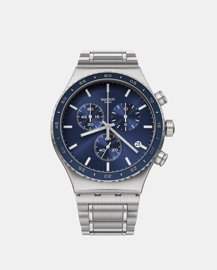 Relógio de quartzo com caixa de aço inoxidável, mostrador azul e bracelete de aço inoxidável cinzento.