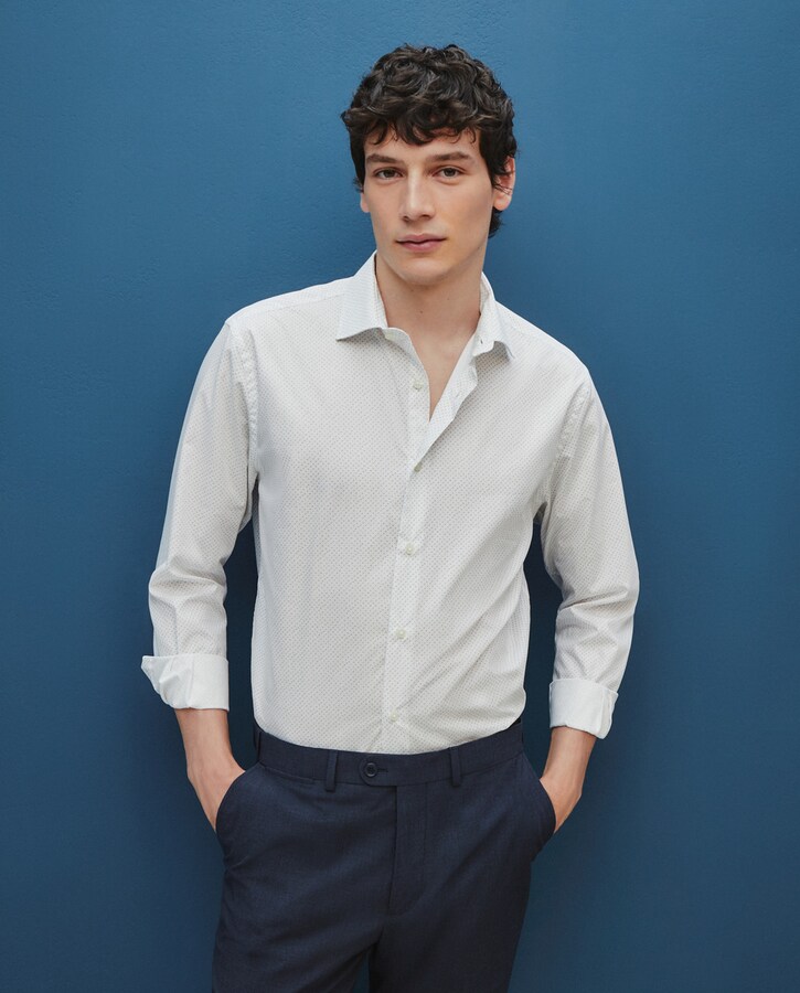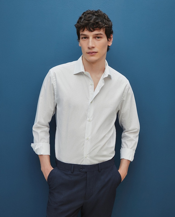 Relaxed fit estreito. Realça a figura, mantendo, ao mesmo tempo, o conforto. Gancho amplo, largura da manga que não restringe os movimentos.
